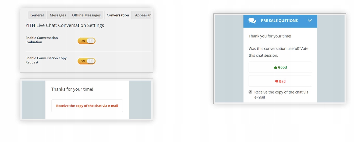 Możesz pozwolić użytkownikom poprosić o kopię prowadzonej rozmowy i jednocześnie sam ją otrzymać, aby ocenić pracę operatora
