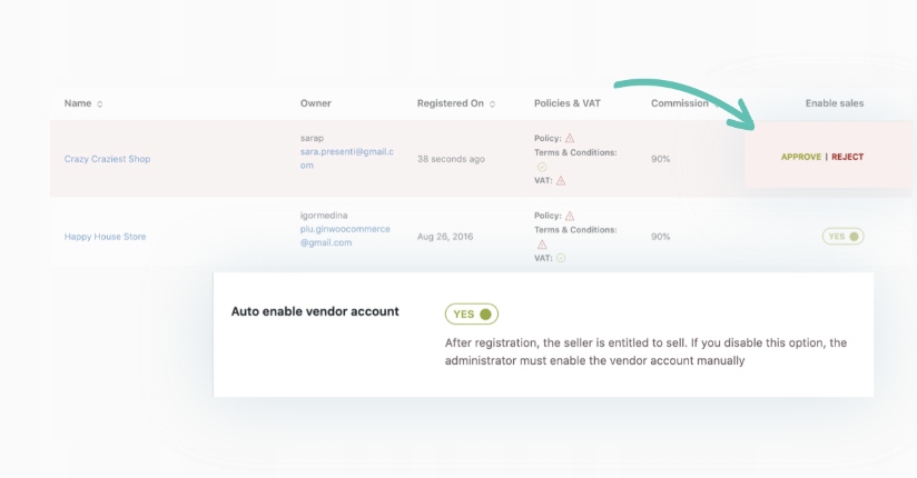Gdy potencjalny sprzedawca zarejestruje się za pomocą formularza, nowy sprzedawca zostanie dodany do listy „wszyscy sprzedawcy” ze statusem „oczekujący” i nie będzie mógł podjąć żadnych dalszych działań, dopóki administrator nie zatwierdzi wniosku ręcznie. Po włączeniu sprzedawcy może on uzyskać dostęp do własnego pulpitu, aby skonfigurować sklep, przesłać nowe produkty itp. Czy wolałbyś pominąć ten ręczny proces? Możesz to zrobić, po prostu włączając opcję automatycznego zatwierdzania nowo zarejestrowanych sprzedawców.