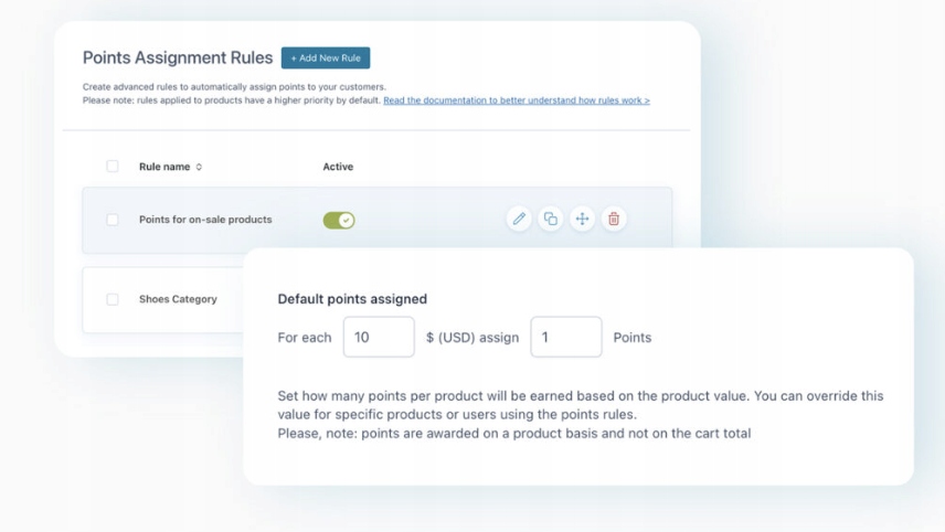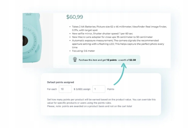 Utwórz globalną regułę, aby określić liczbę punktów, które mają zostać przyznane na podstawie wartości produktu, a w razie potrzeby przypisać inną liczbę określonym produktom lub kategoriom (np. możesz przyznać większą liczbę punktów tylko za zakup produktu X, a produktom należącym do kategorii Y w ogóle nie przyznać punktów).