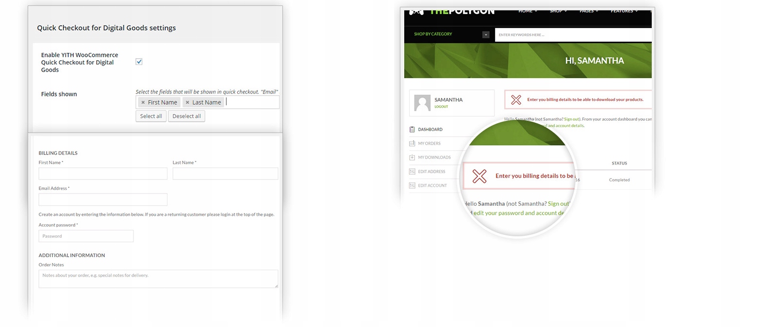 YITH WooCommerce Quick Checkout for Digital Goods Premium to rozszerzenie WooCommerce opracowane przez YITHEMES. YITH WooCommerce Quick Checkout for Digital Goods Premium pozwala usunąć niepotrzebne informacje ze strony płatności.
